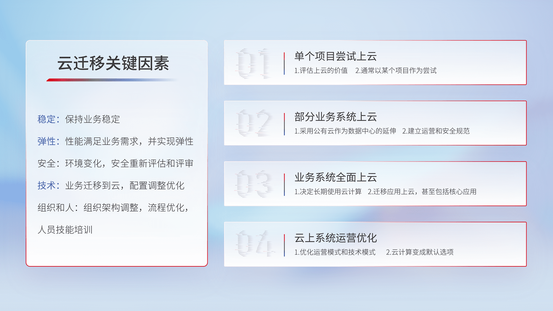 结合实际业务,,从规划设计、、、、云平台选型、、、云原生改造、、、数据迁移、、、、集成交付,,,,迁移全过程为客户识别最佳上云路径,,,做好风险识别管理,,,,设计网络架构、、、、身份权限、、安全审计合规、、、、操作审计、、、、日志审计、、、、监控告警策略、、多站点容灾设计等,,,对云上基础设施进行整体规划,,提升IT治理水平,,,以满足弹性、、、、高可用、、、、高性能的需求。。。。