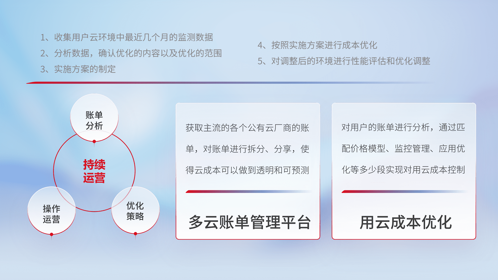 通过多云纳管,,,以统一的资源数据模型把客户的云资源进行抽象和封装,,,进而实现对多云资源的统一操作,,,保障云资源管理的可靠性、、、、稳定性与可用性。。量身定制化运维内容,,,配置、、开发运维、、补丁管理、、备份、、、、监控、、认证和访问管理、、审计和日常巡检等,,保障在用云过程中的可靠度,,,稳定度以及高可用率。。。